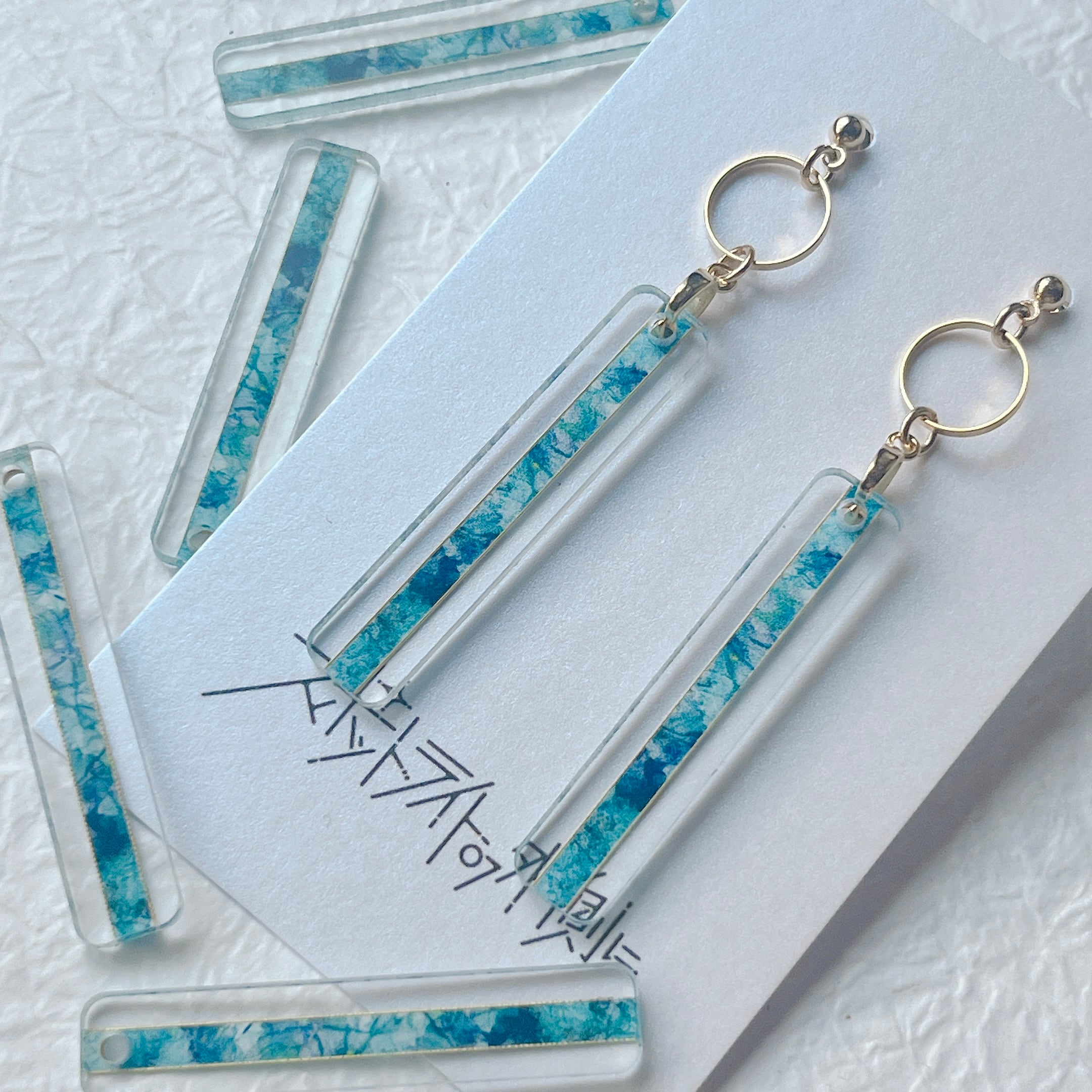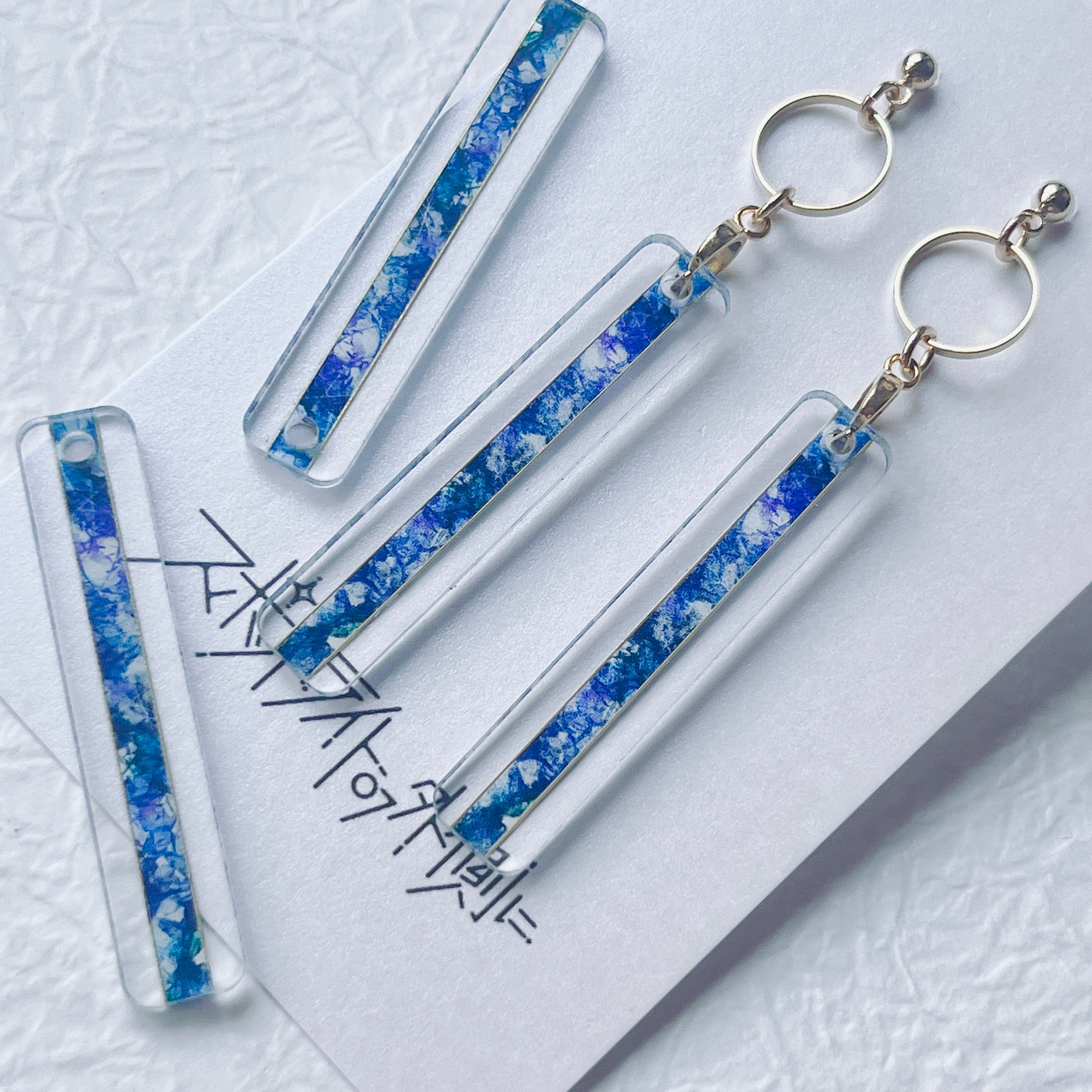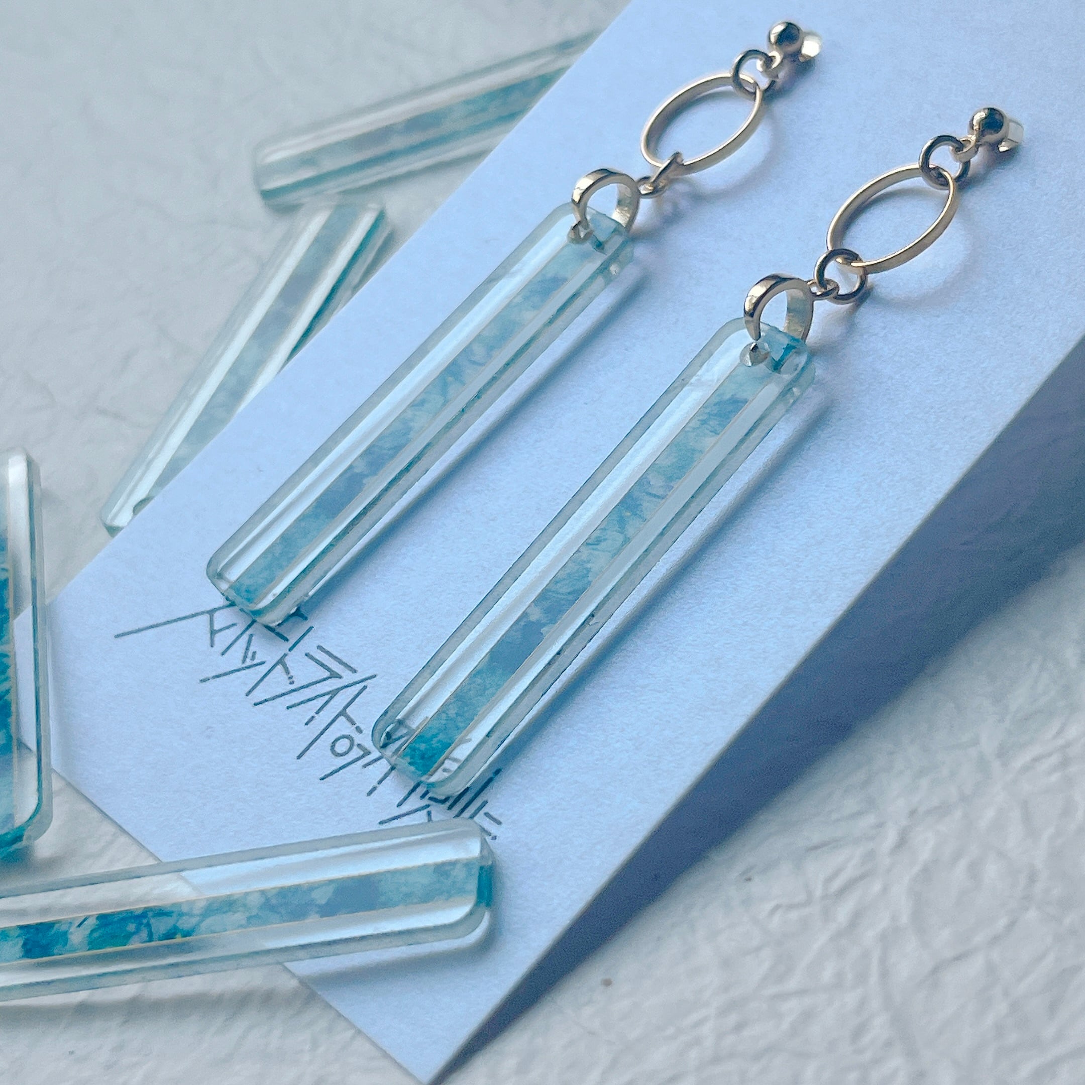 透明アクリルに繊細なイラストを閉じ込めた、細長い絵画のようなアクセサリーです。