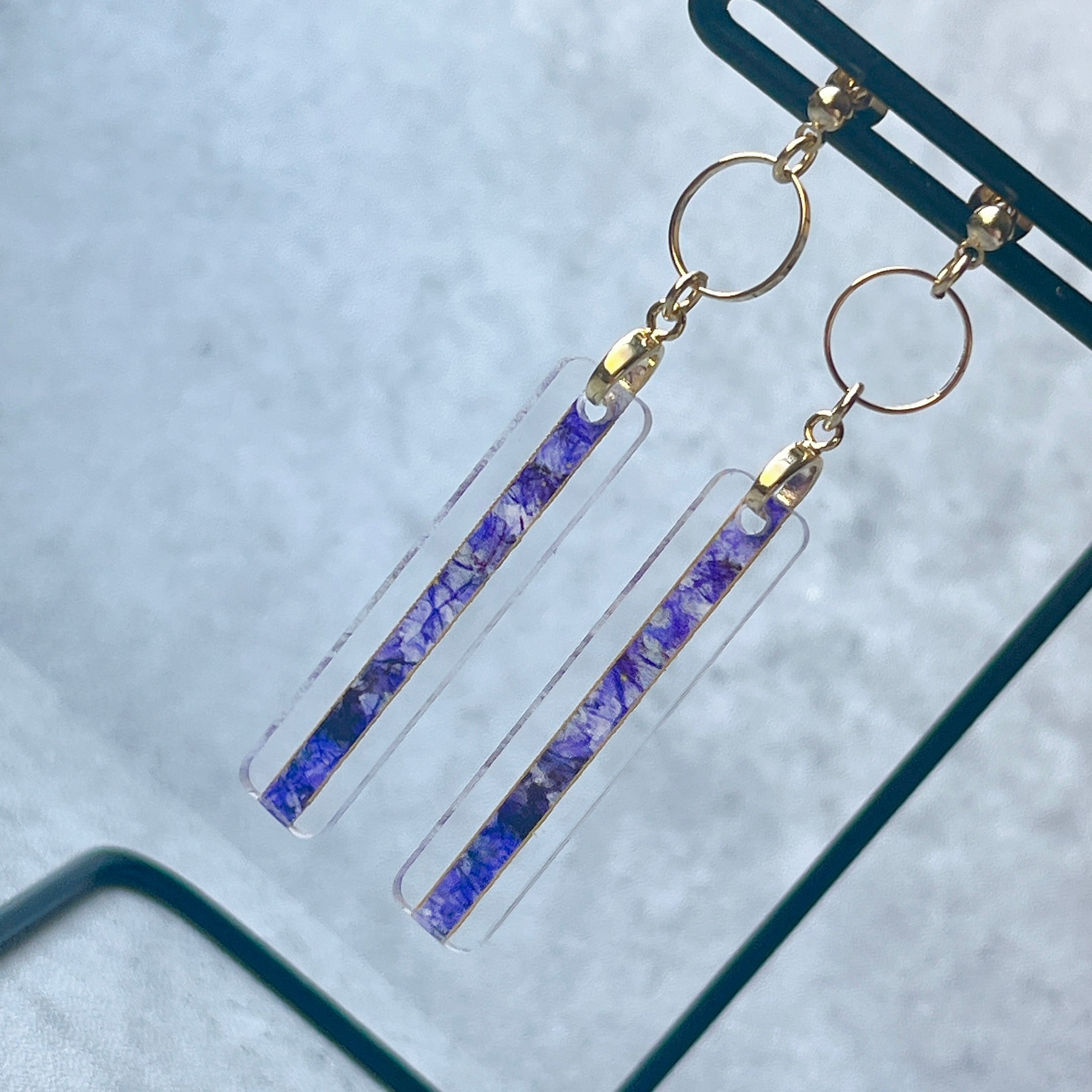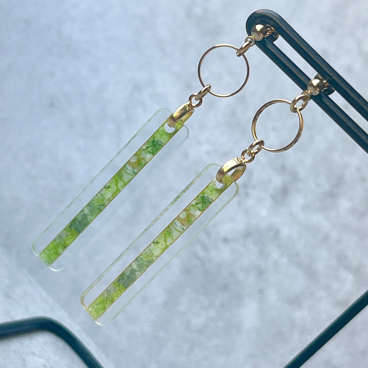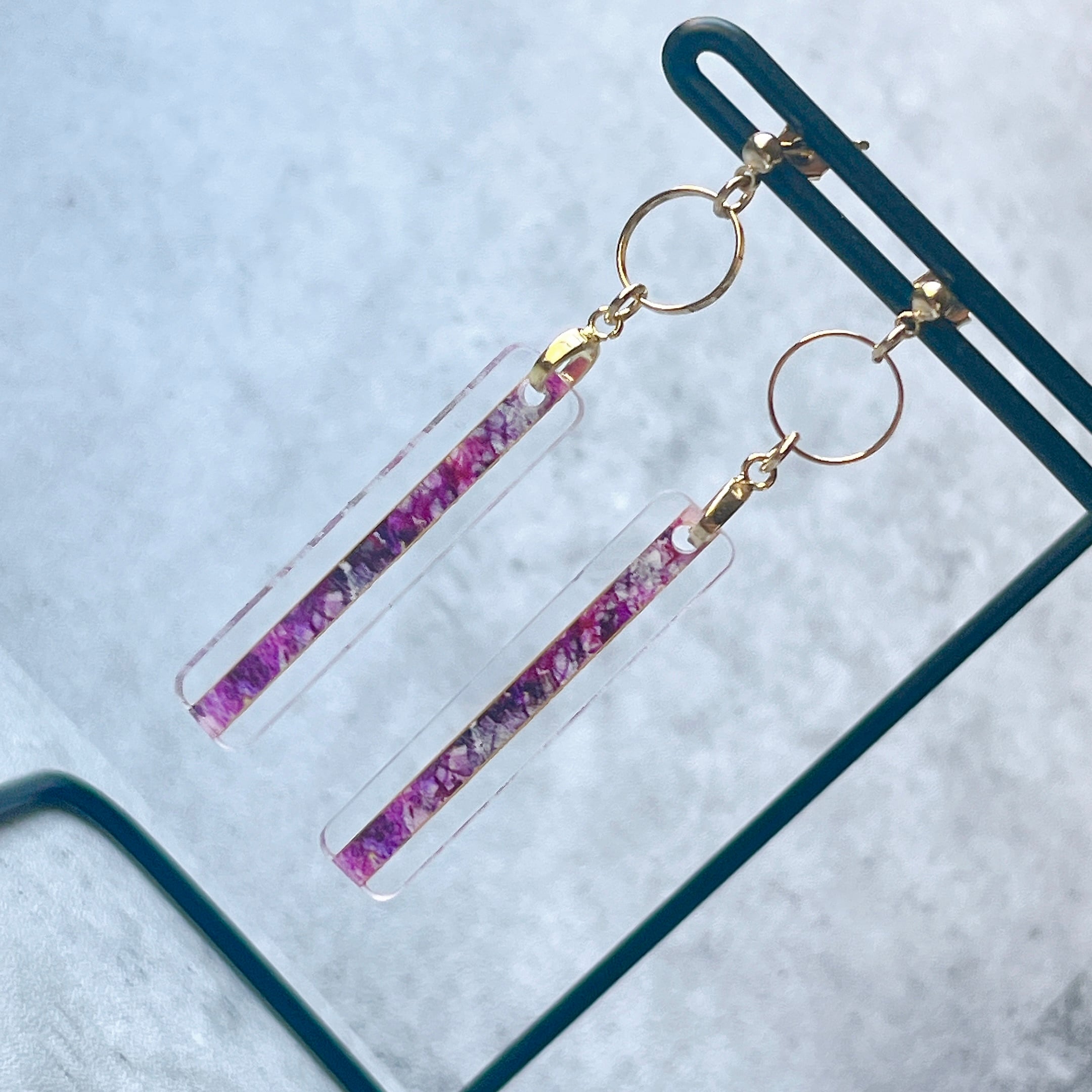 透明アクリルに繊細なイラストを閉じ込めた、細長い絵画のようなアクセサリーです。