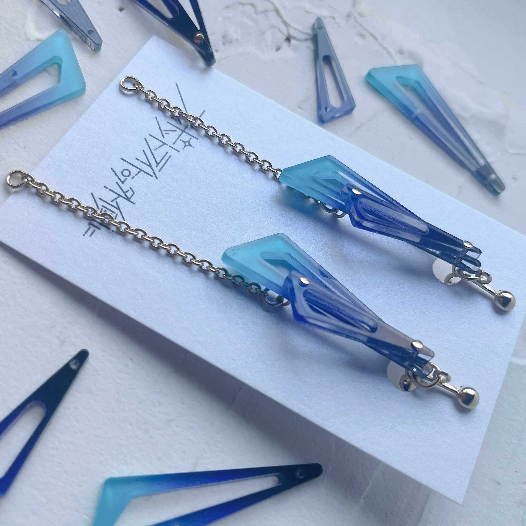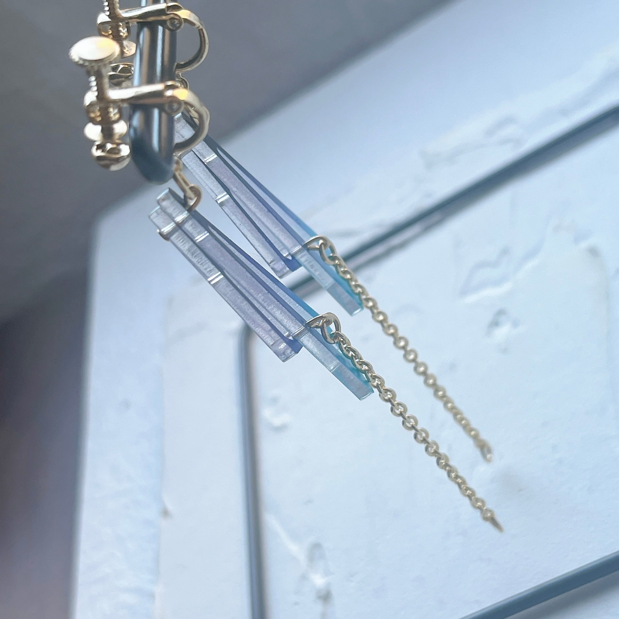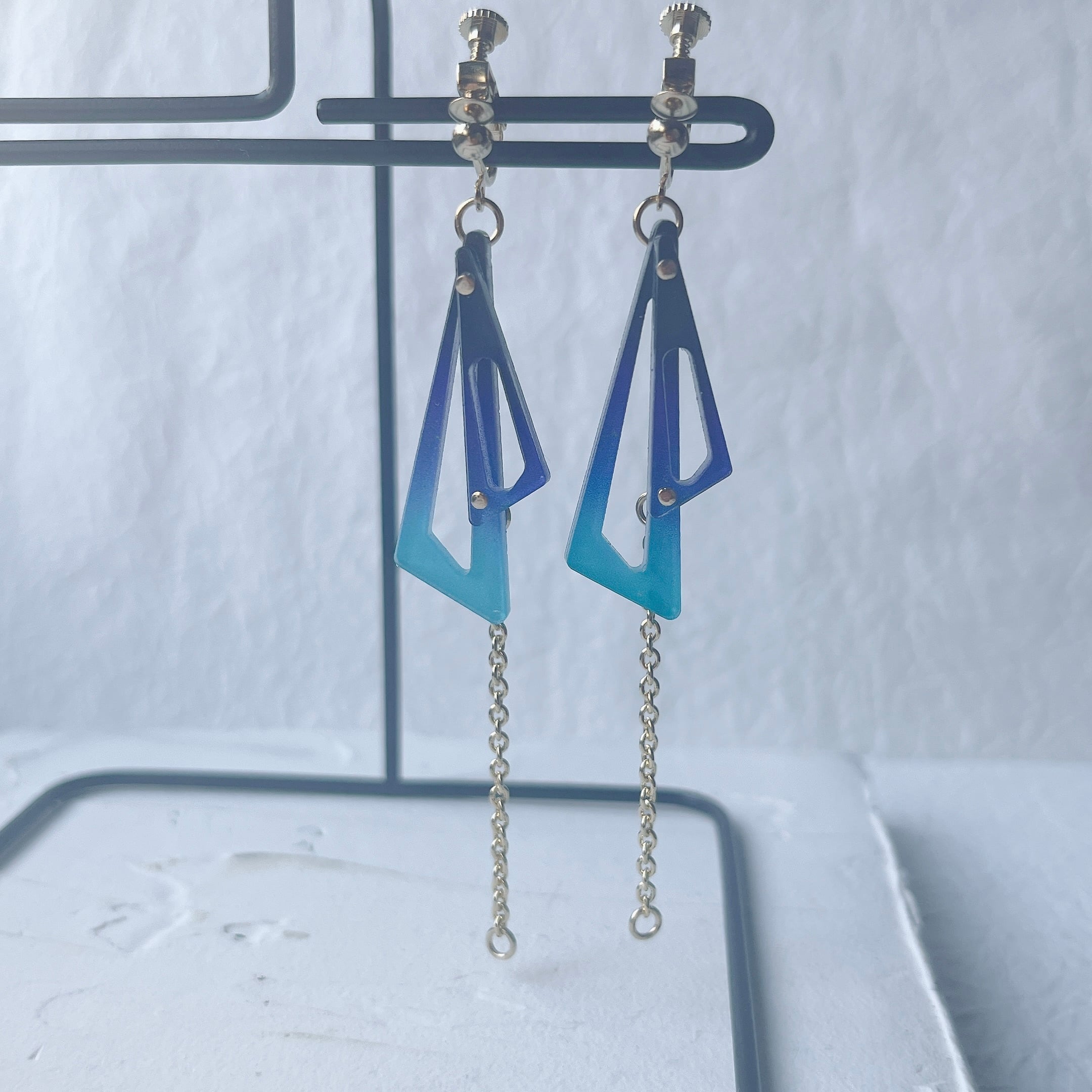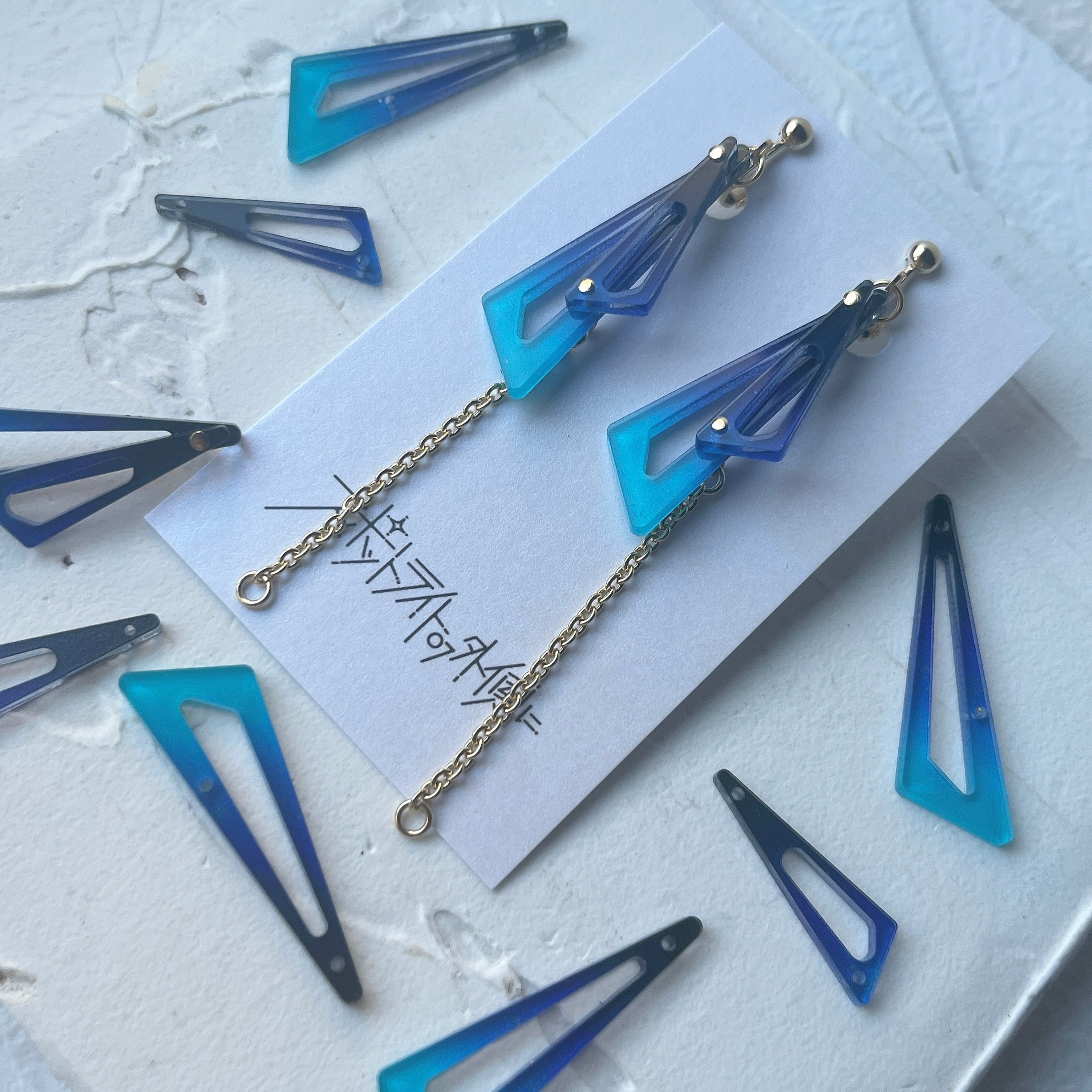 ずれながら重なる三角を静かにとどめた耳飾りです。