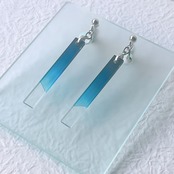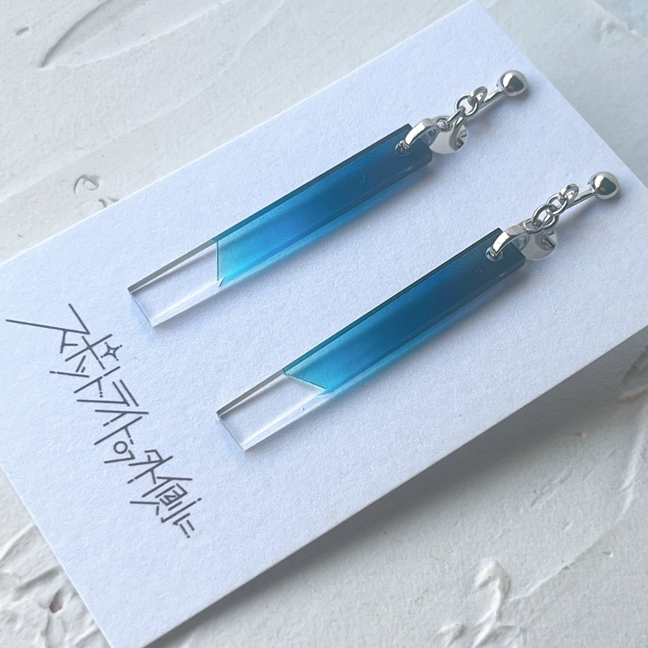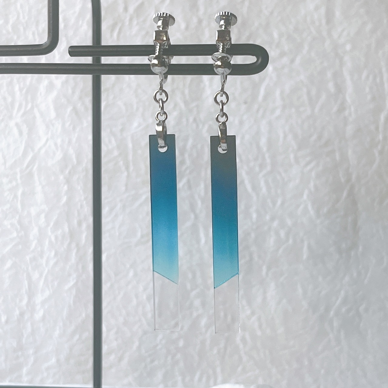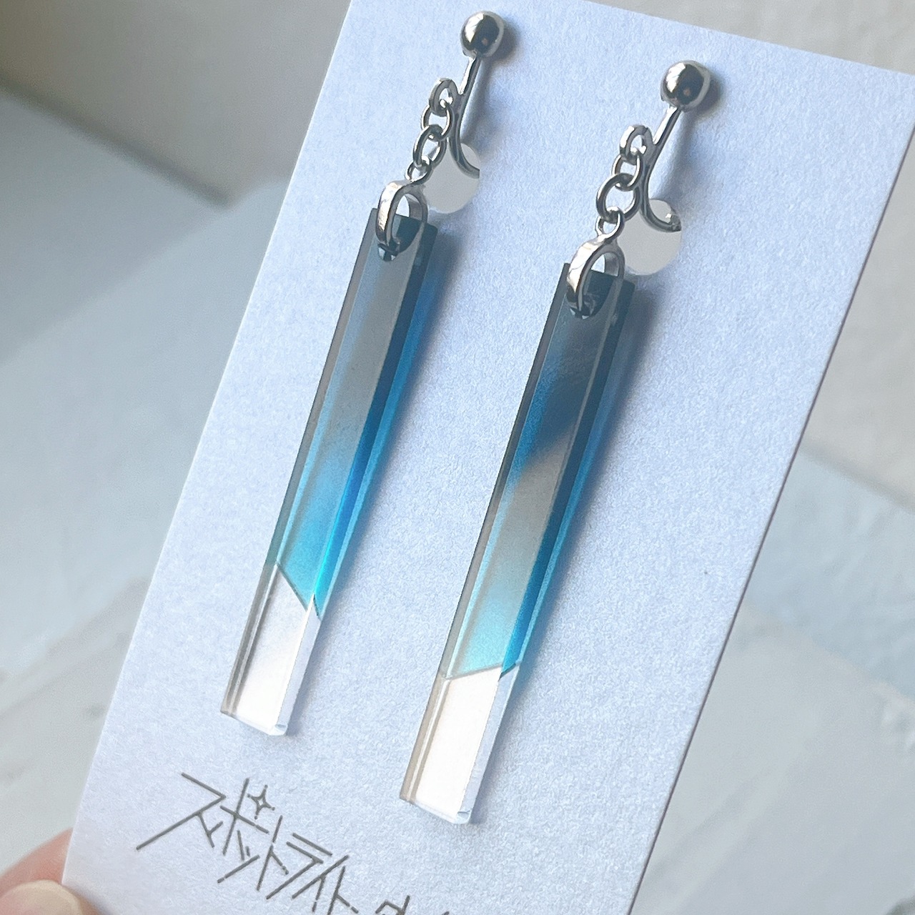 厚さ2mmの透明アクリルを、6mm×45mmの細身の形に仕立てた耳飾りです。