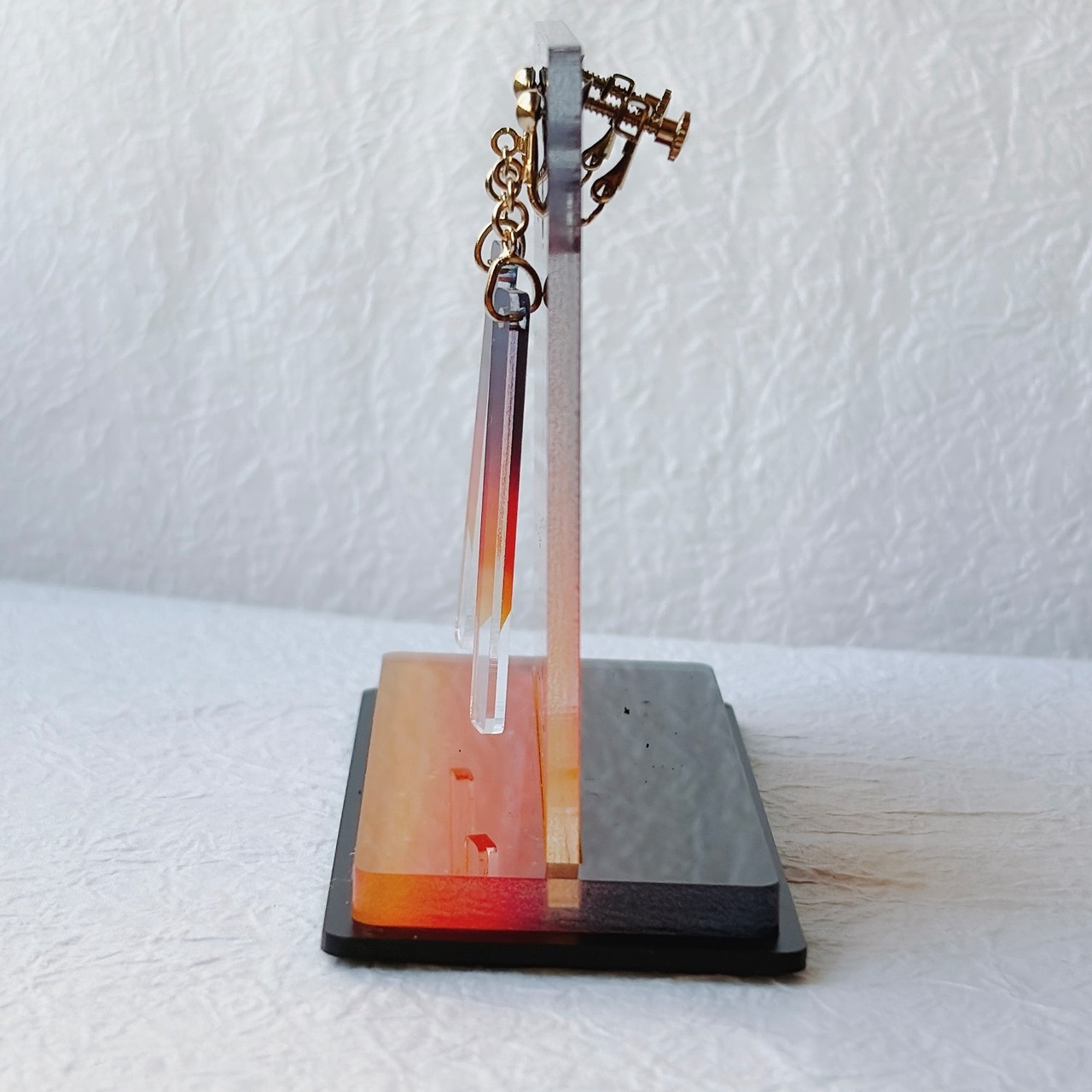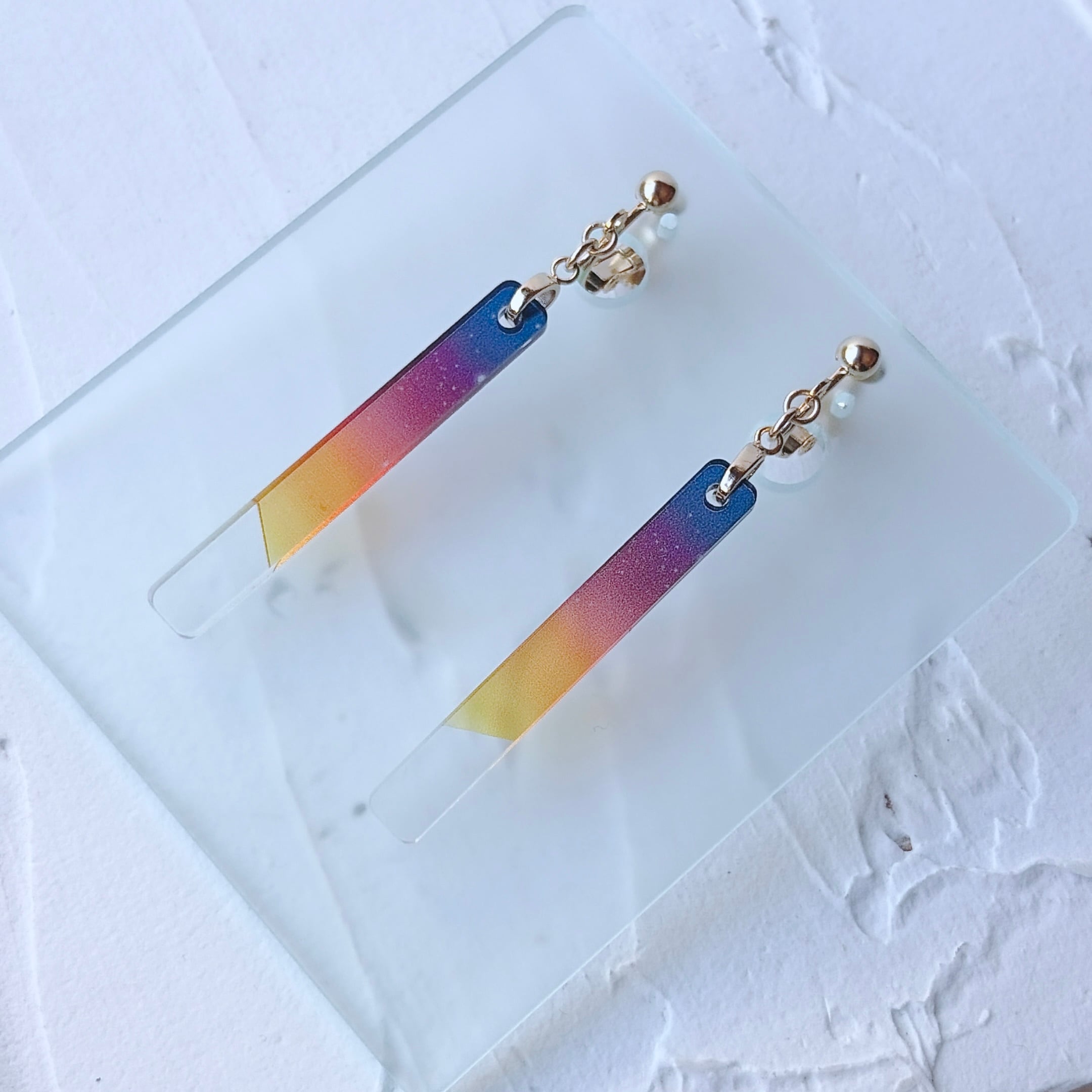 厚さ2mmの透明アクリルを、6mm×45mmの細身の形に仕立てた耳飾りです。