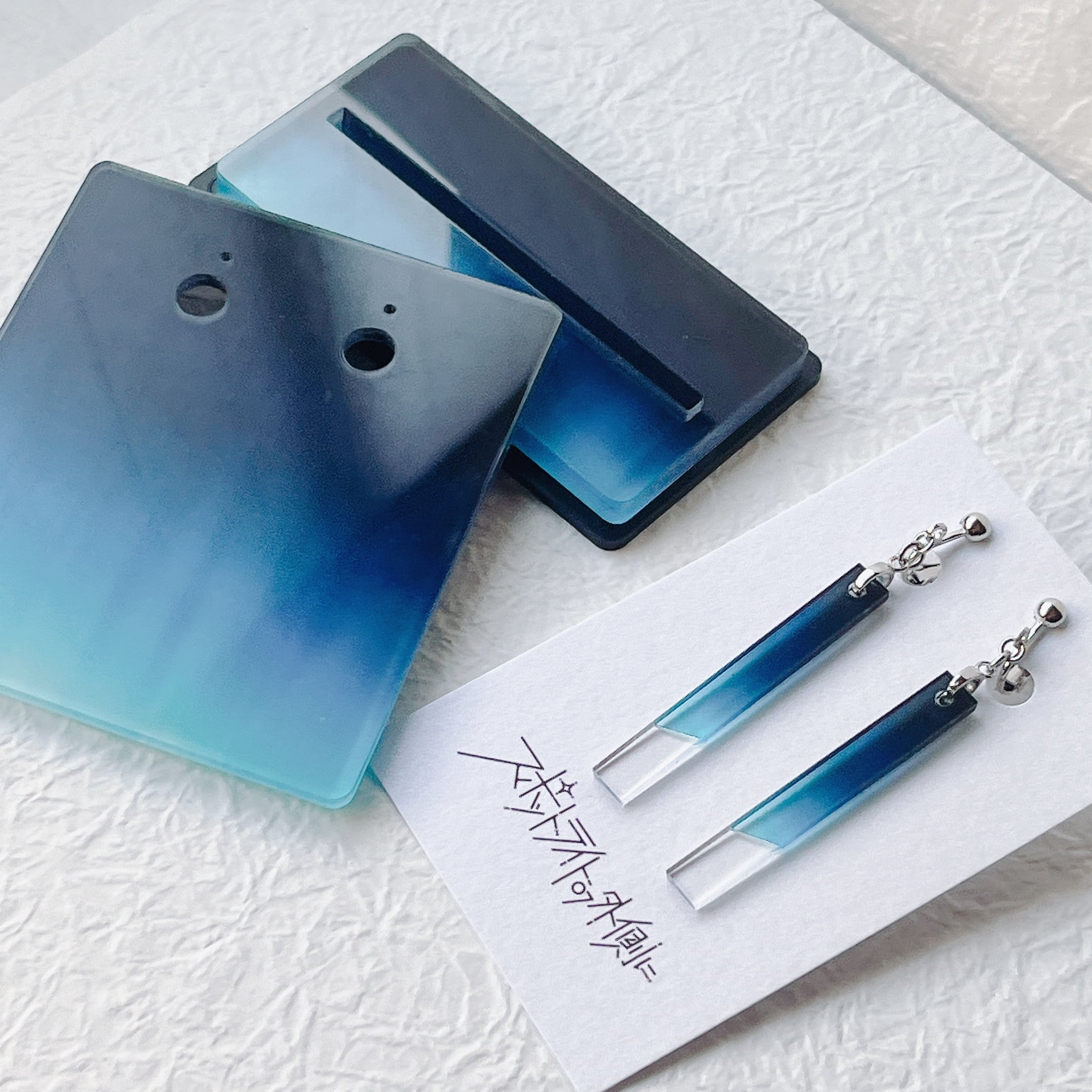 厚さ2mmの透明アクリルを、6mm×45mmの細身の形に仕立てた耳飾りです。