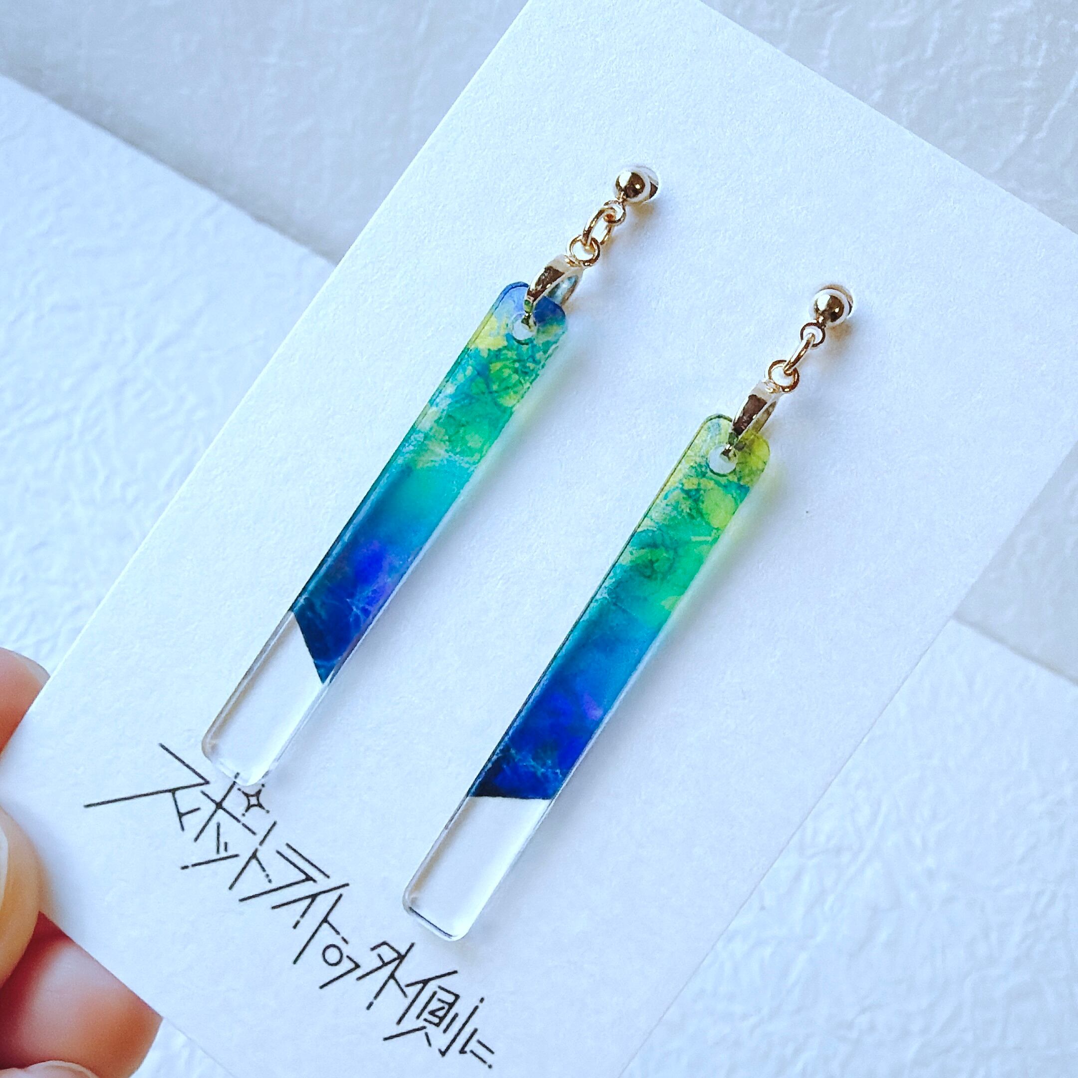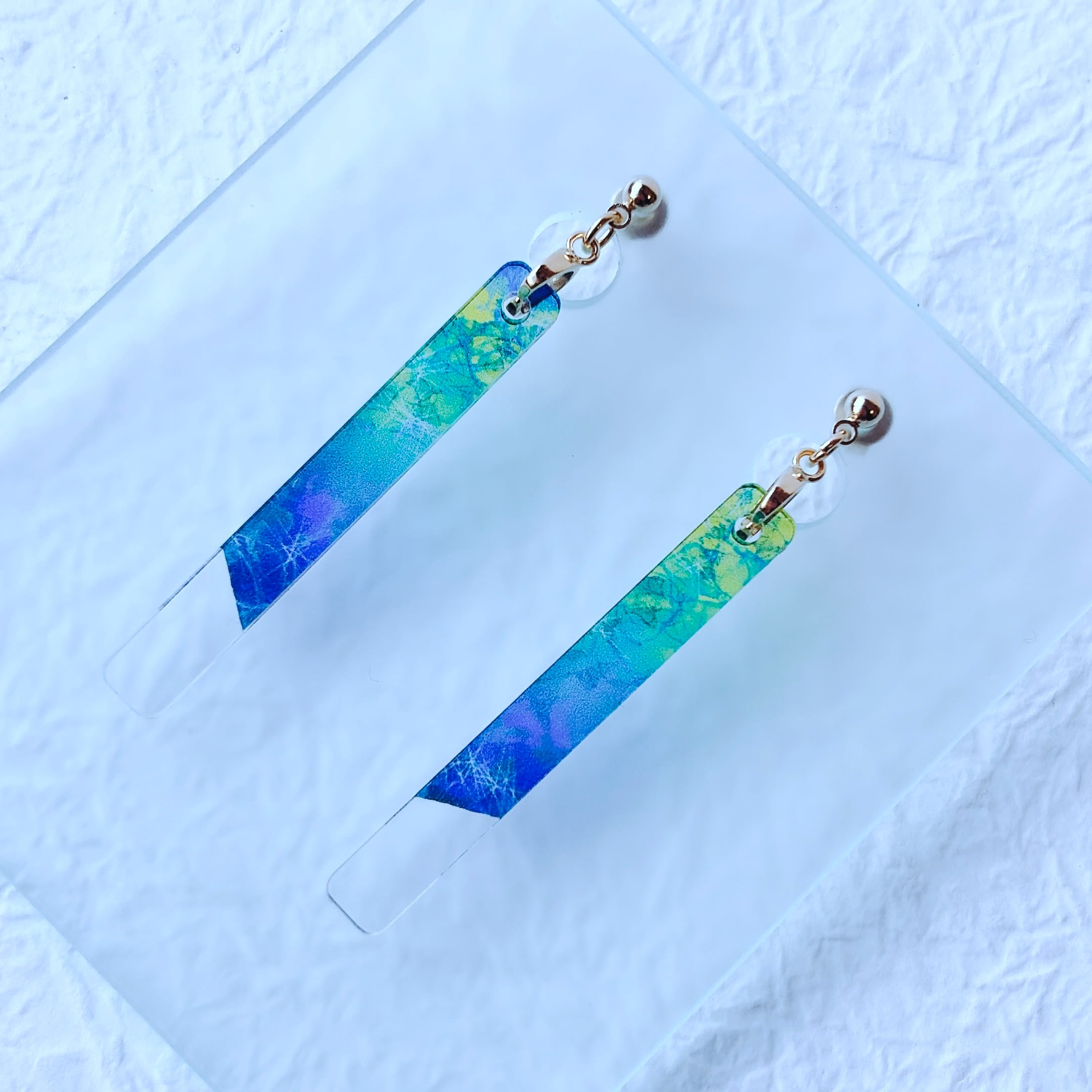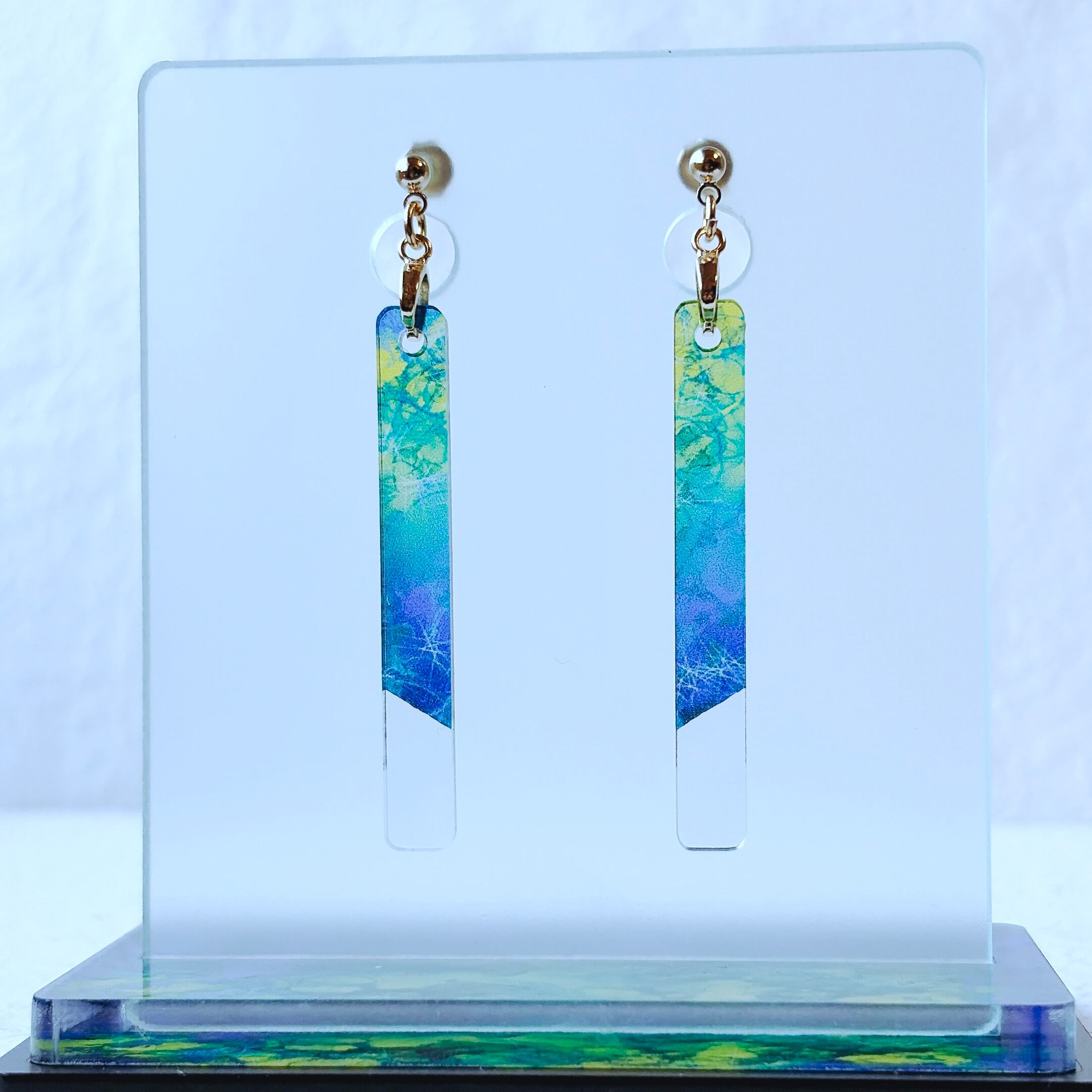厚さ2mmの透明アクリルを、6mm×45mmの細身の形に仕立てた耳飾りです。