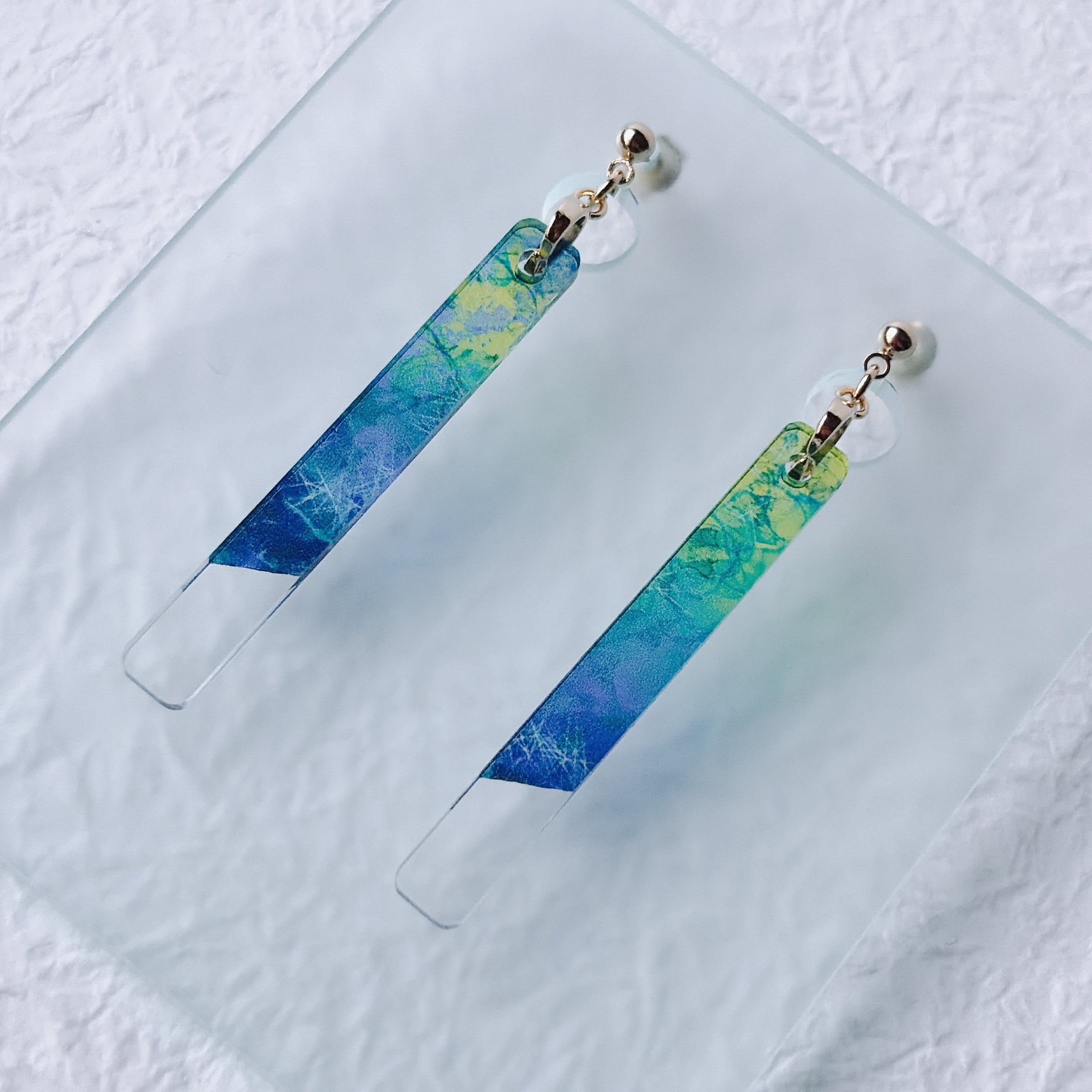 厚さ2mmの透明アクリルを、6mm×45mmの細身の形に仕立てた耳飾りです。