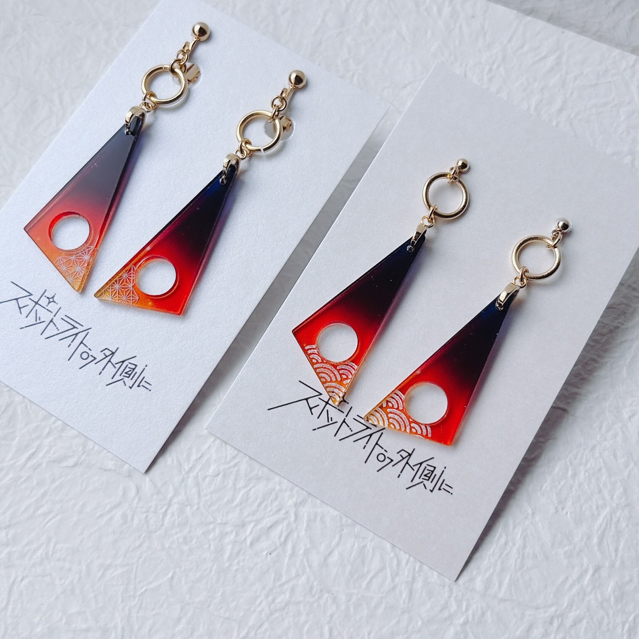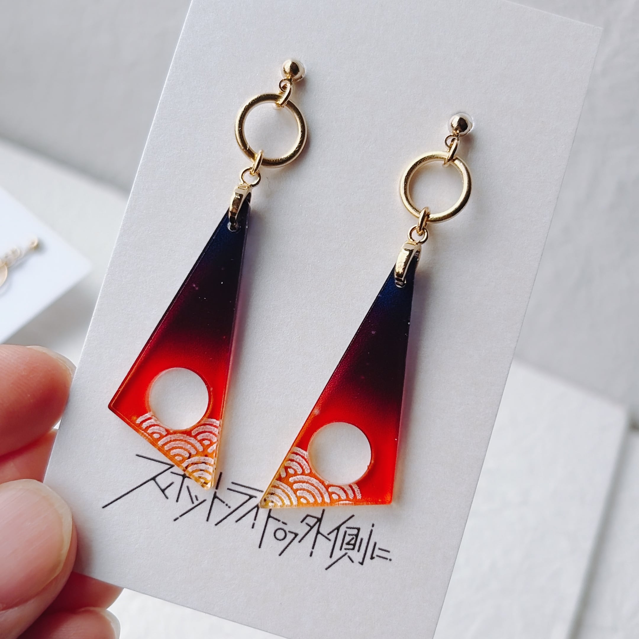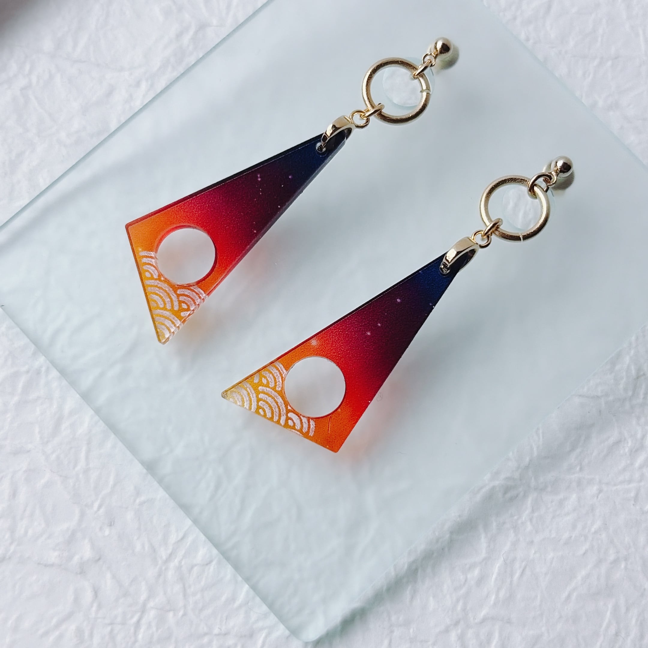厚さ2mmの透明アクリルを、15mm×40mmのシャープな三角形に仕立てた耳飾りです。
