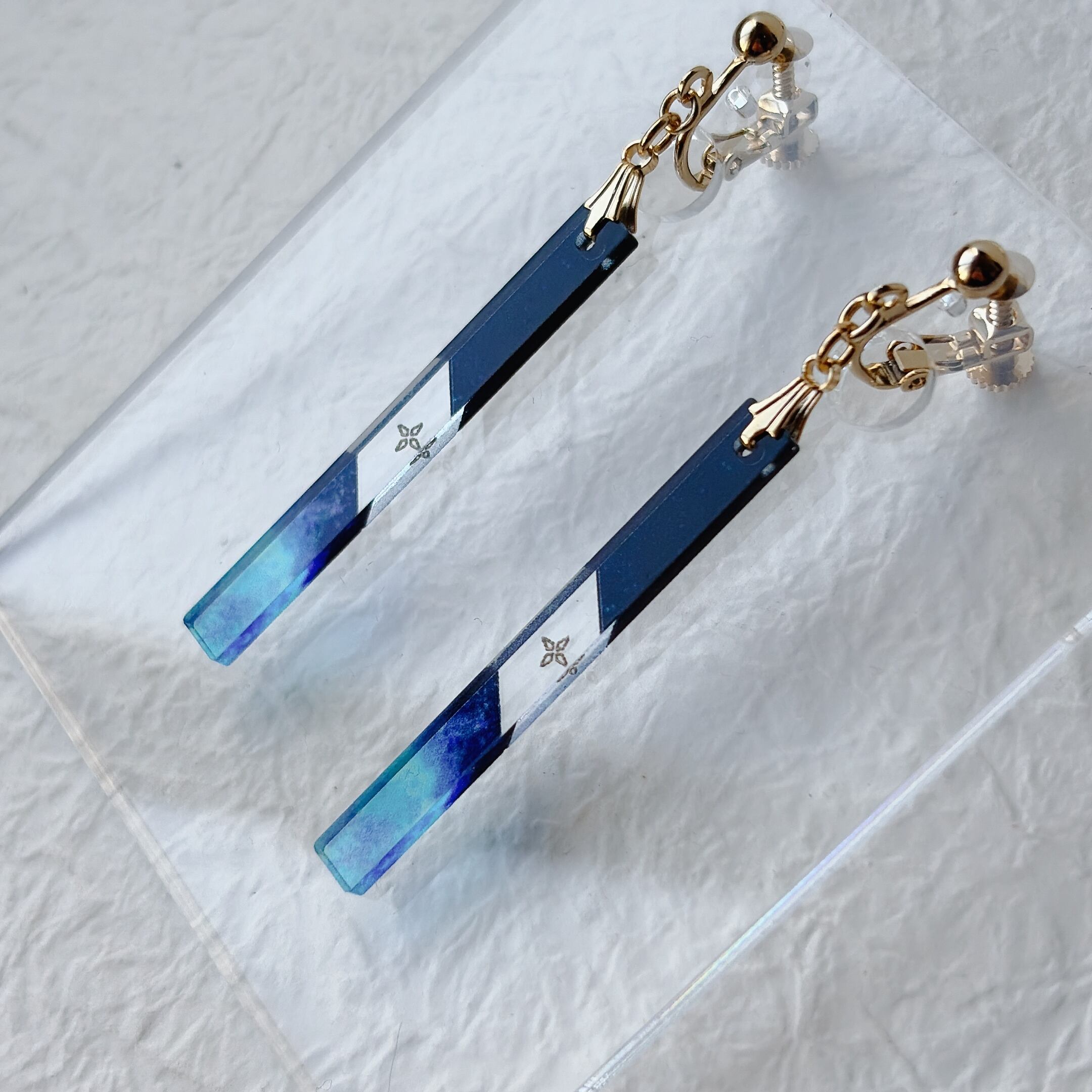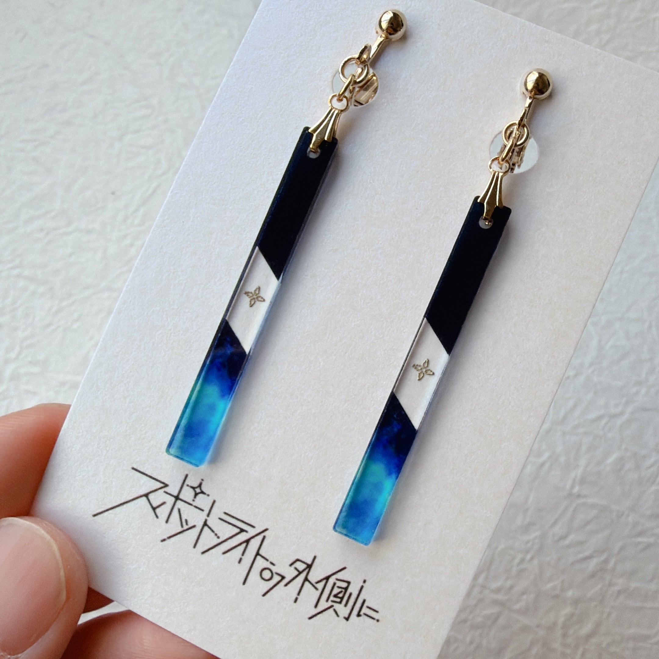 厚さ2mmの透明アクリルを、5mm×45mmの細身な形に仕立てた耳飾りです。