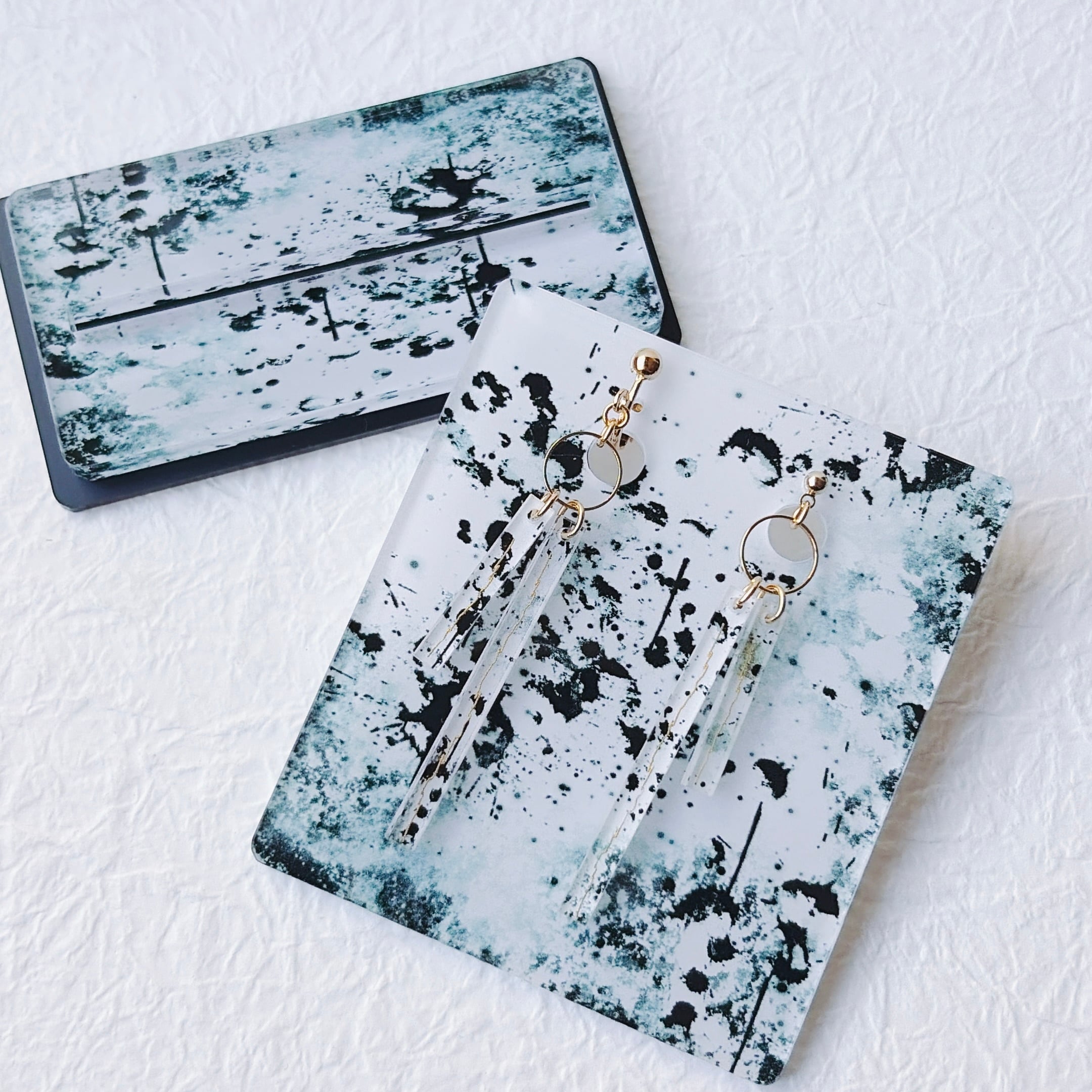透明なアクリルに、一筋の直線を刻み込んだ耳飾り「一閃」。